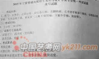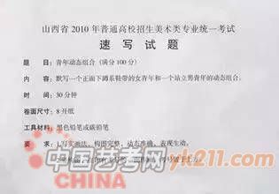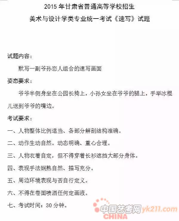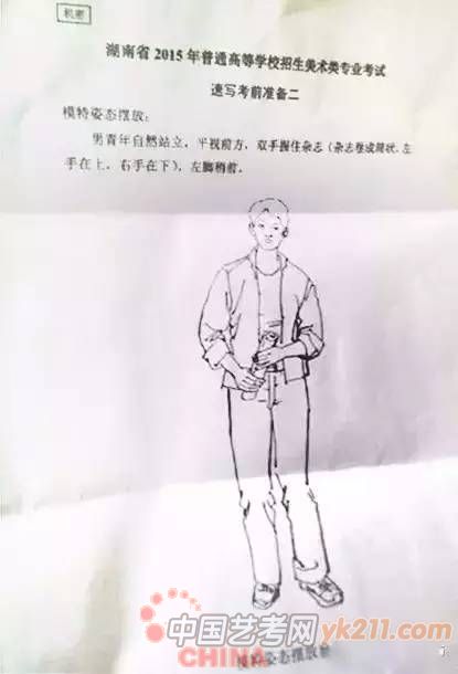 2012年:默写,女青年坐姿,自然刘海,直发马尾辫,免冠,不戴眼镜,身着冬天穿的棉大衣(短款)或羽绒服(短款),牛仔裤,运动鞋,左手扶着膝盖,右手自然放在腿上,左脚在前,只能画正面或斜45度角,不能画背面。(30分钟,8开)