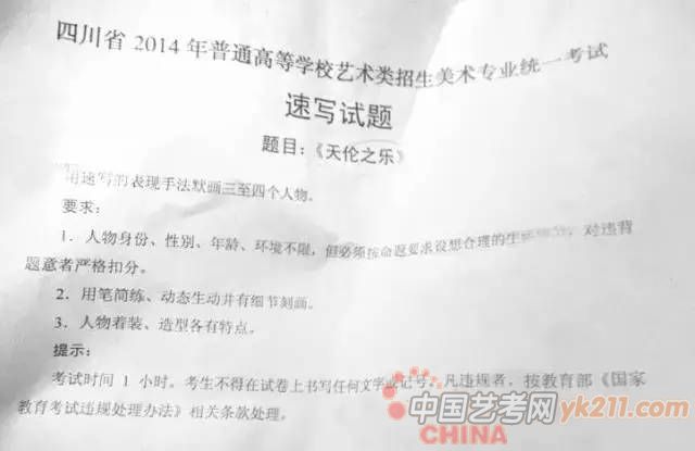 2014年:默写,在桶装水的分销店里,一个工人把一桶水扛在肩上(站姿,男性)一个工人正在休息(坐姿,男性)。可以加上与情节有关的道具和环境,组成一幅完整的画面。(30分钟,8开)